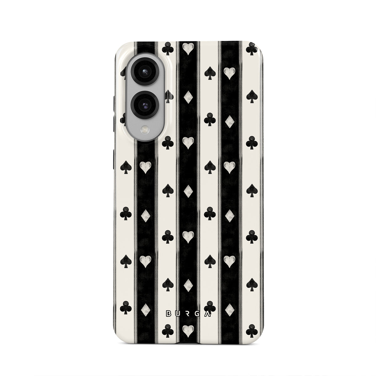 このデザインの特徴黒と白のストライプ、ハート、トランプのスート、ヴィンテージスタイル