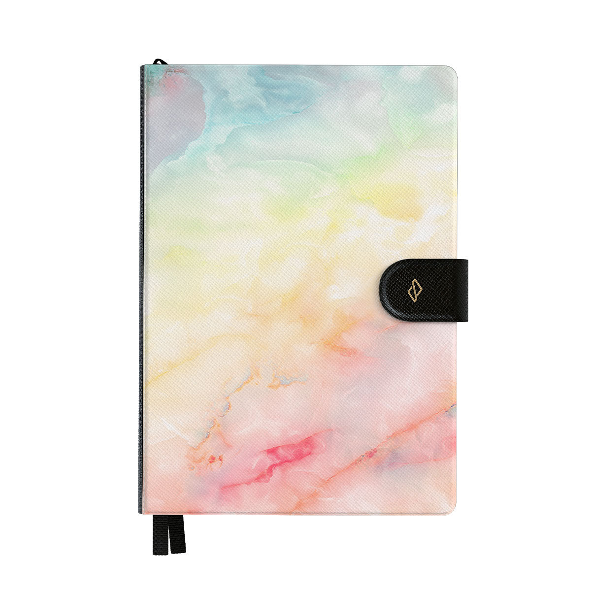 日付が書かれていないミニマリストなデザインで、手帳・スケジュール帳・ダイアリーとして使えます。表紙のハードカバーには、心地よい手触りのヴィーガンサフィアーノレザーを使用。スリムな磁気べえると付きの頑丈な手帳で、コーヒーをこぼしたり、うっかり手帳を落としたりしても安心です。