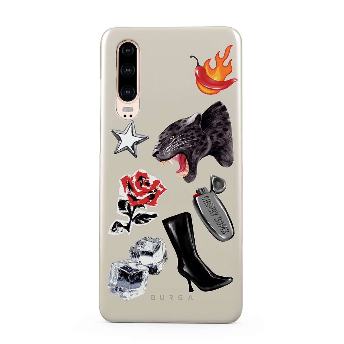 このデザインの特徴:、黒いパンサー、赤いバラ、燃えるパプリカ、シルバーのライター、黒いニーハイブーツ、氷、シルバーの星が含まれています。