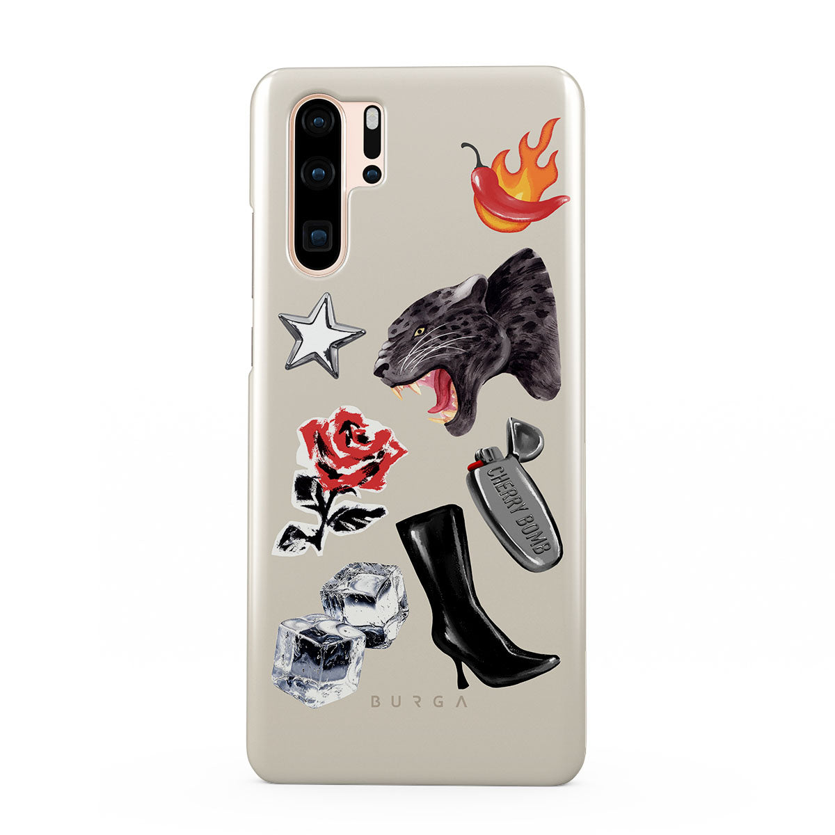 このデザインの特徴:、黒いパンサー、赤いバラ、燃えるパプリカ、シルバーのライター、黒いニーハイブーツ、氷、シルバーの星が含まれています。