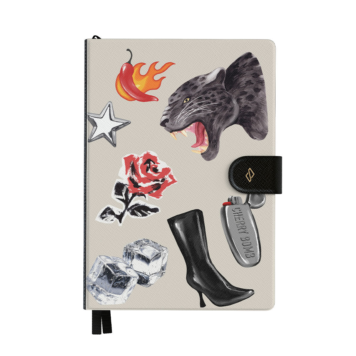 このデザインの特徴:、黒いパンサー、赤いバラ、燃えるパプリカ、シルバーのライター、黒いニーハイブーツ、氷、シルバーの星が含まれています。