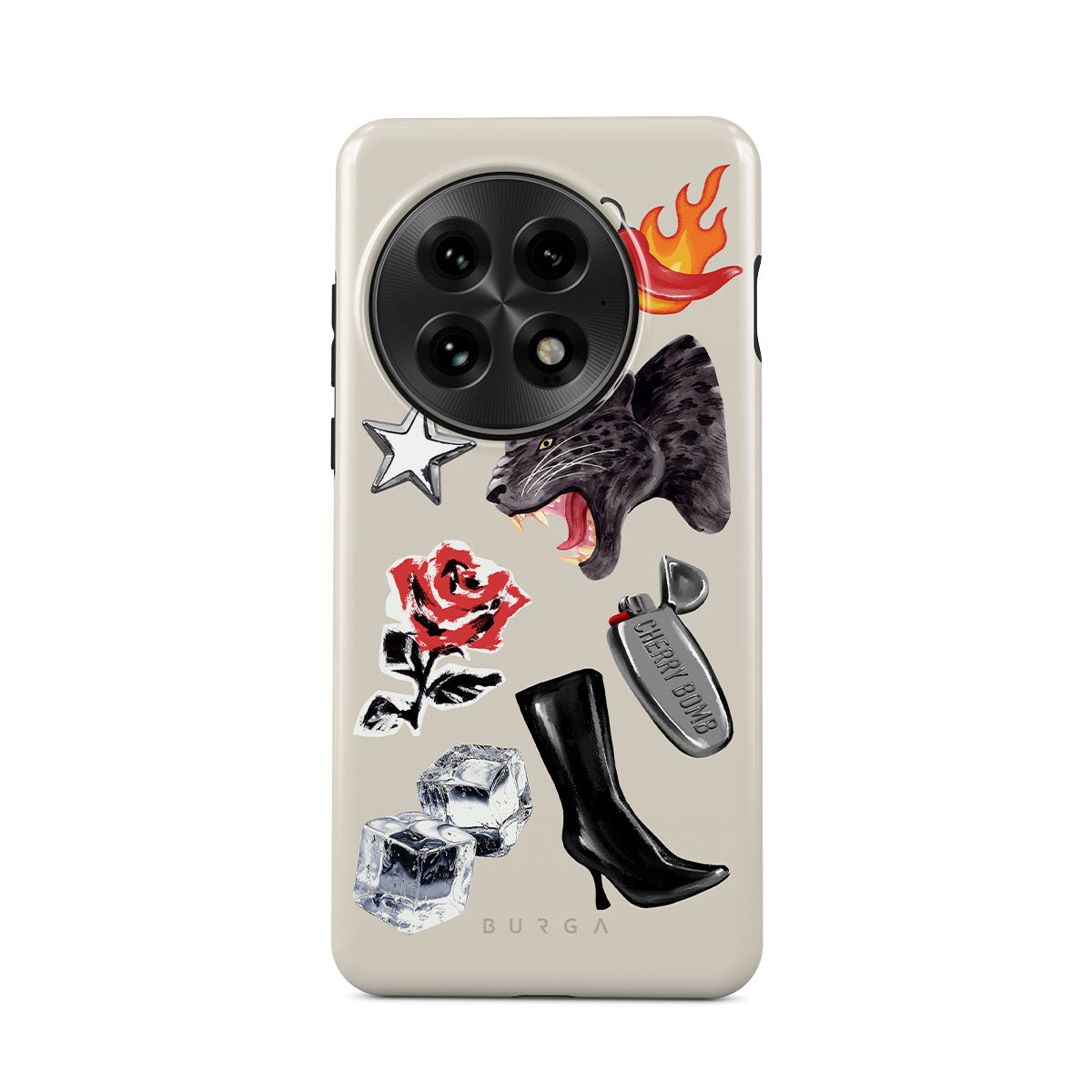 このデザインの特徴:、黒いパンサー、赤いバラ、燃えるパプリカ、シルバーのライター、黒いニーハイブーツ、氷、シルバーの星が含まれています。