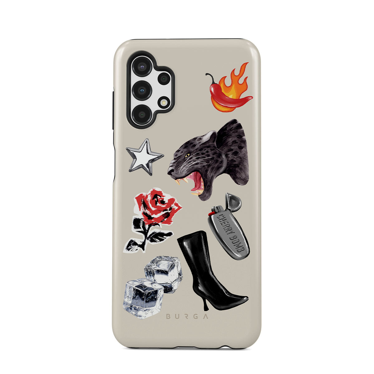 このデザインの特徴:、黒いパンサー、赤いバラ、燃えるパプリカ、シルバーのライター、黒いニーハイブーツ、氷、シルバーの星が含まれています。