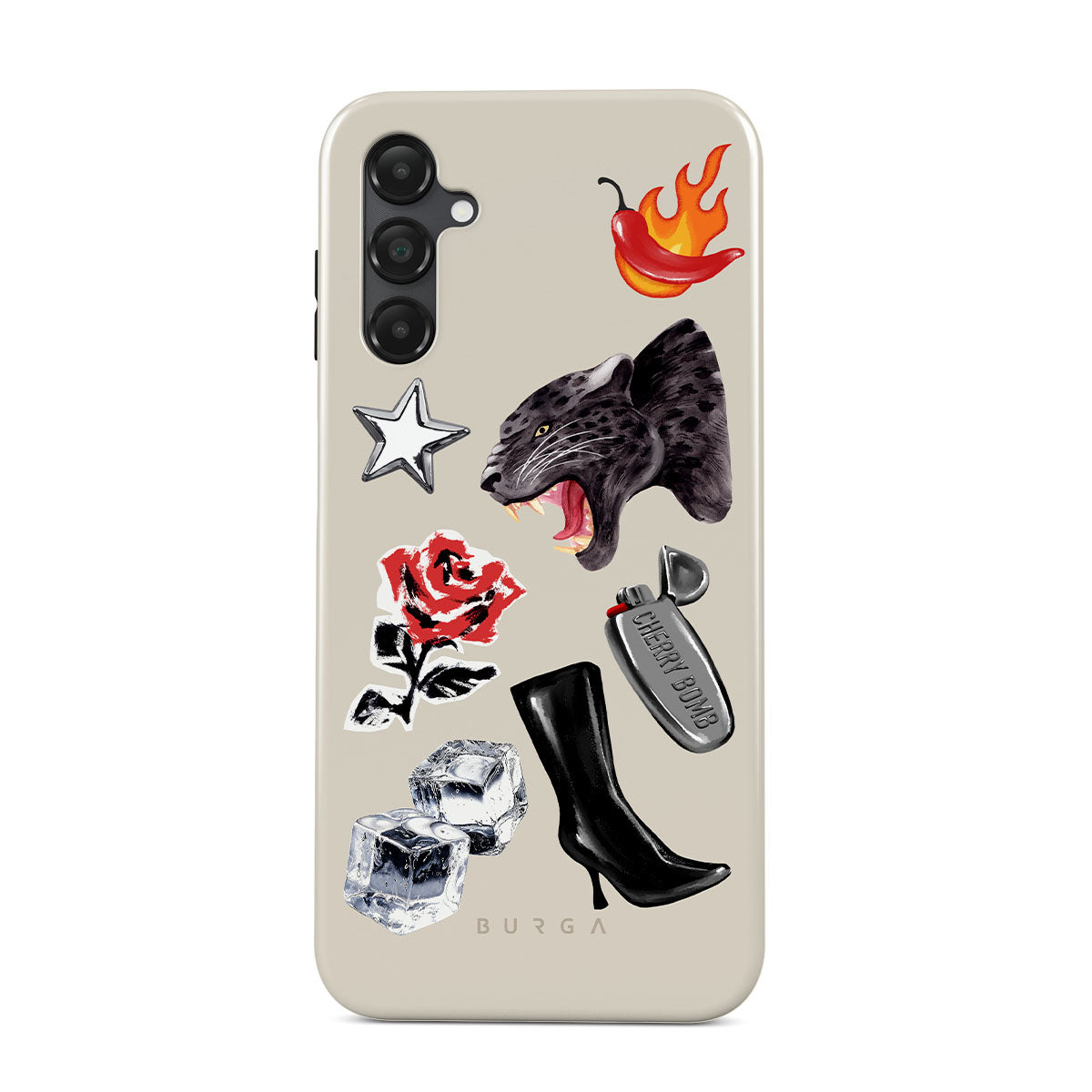このデザインの特徴:、黒いパンサー、赤いバラ、燃えるパプリカ、シルバーのライター、黒いニーハイブーツ、氷、シルバーの星が含まれています。