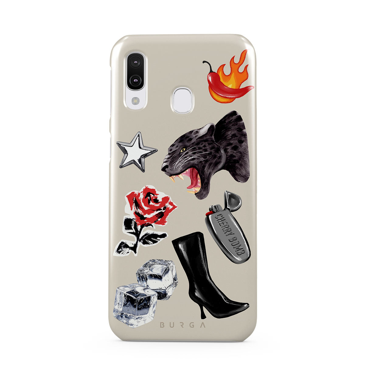このデザインの特徴:、黒いパンサー、赤いバラ、燃えるパプリカ、シルバーのライター、黒いニーハイブーツ、氷、シルバーの星が含まれています。