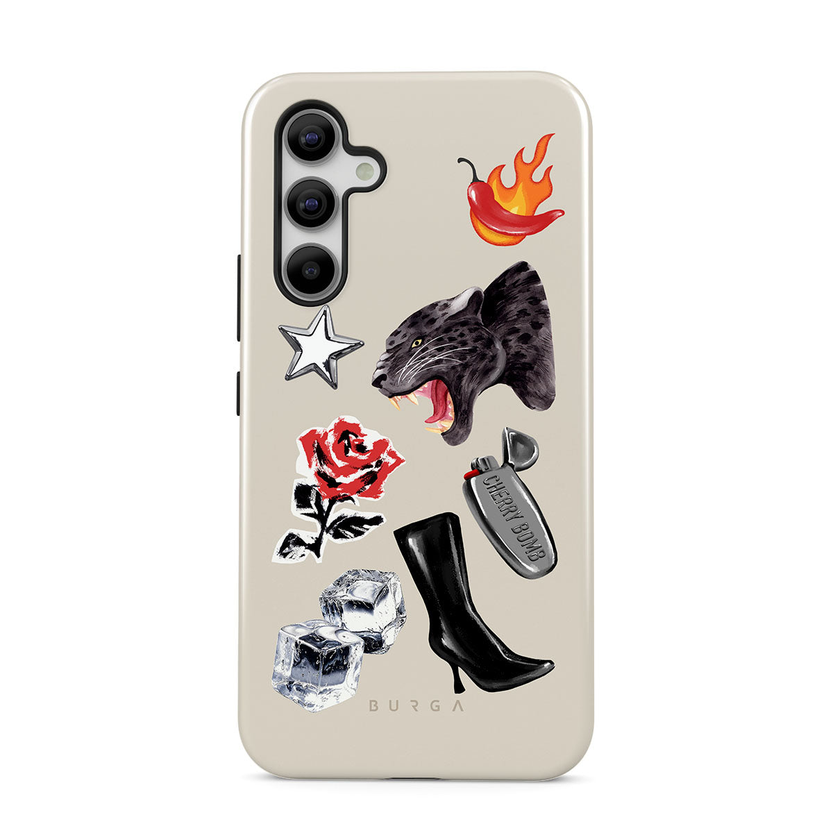 このデザインの特徴:、黒いパンサー、赤いバラ、燃えるパプリカ、シルバーのライター、黒いニーハイブーツ、氷、シルバーの星が含まれています。