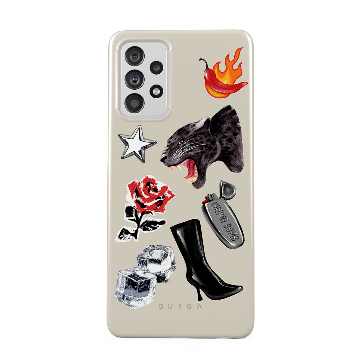 このデザインの特徴:、黒いパンサー、赤いバラ、燃えるパプリカ、シルバーのライター、黒いニーハイブーツ、氷、シルバーの星が含まれています。