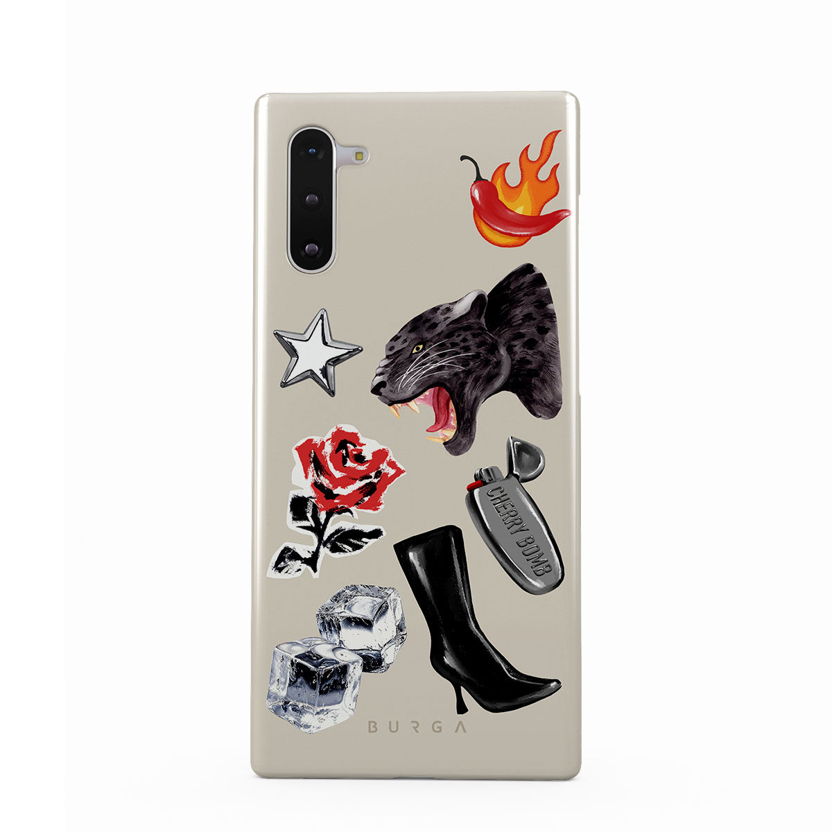 このデザインの特徴:、黒いパンサー、赤いバラ、燃えるパプリカ、シルバーのライター、黒いニーハイブーツ、氷、シルバーの星が含まれています。
