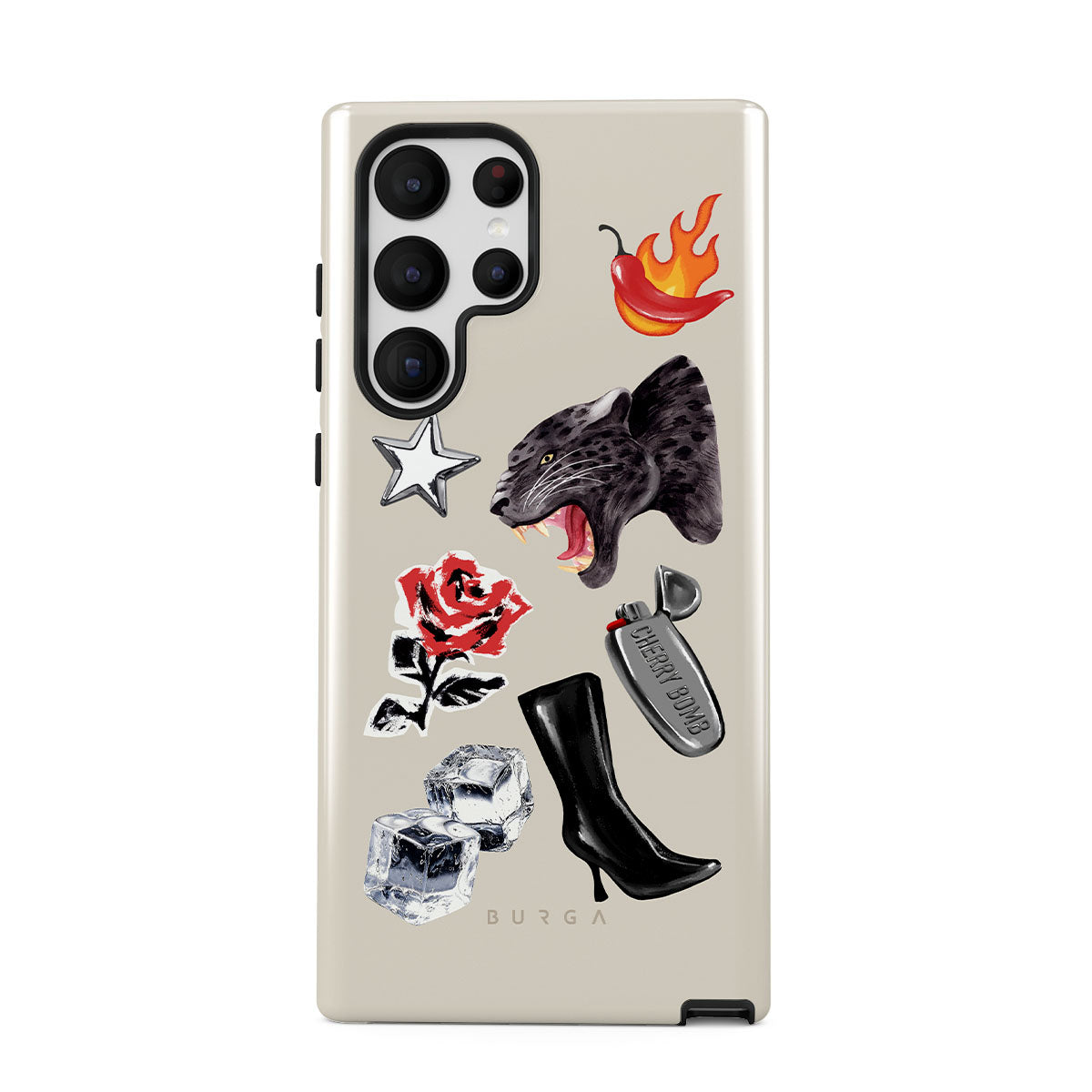 このデザインの特徴:、黒いパンサー、赤いバラ、燃えるパプリカ、シルバーのライター、黒いニーハイブーツ、氷、シルバーの星が含まれています。