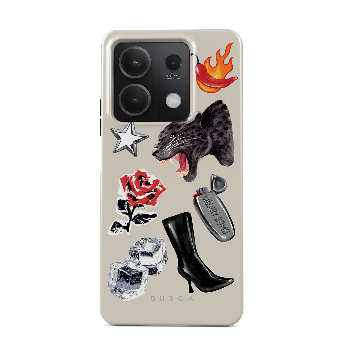 このデザインの特徴:、黒いパンサー、赤いバラ、燃えるパプリカ、シルバーのライター、黒いニーハイブーツ、氷、シルバーの星が含まれています。
