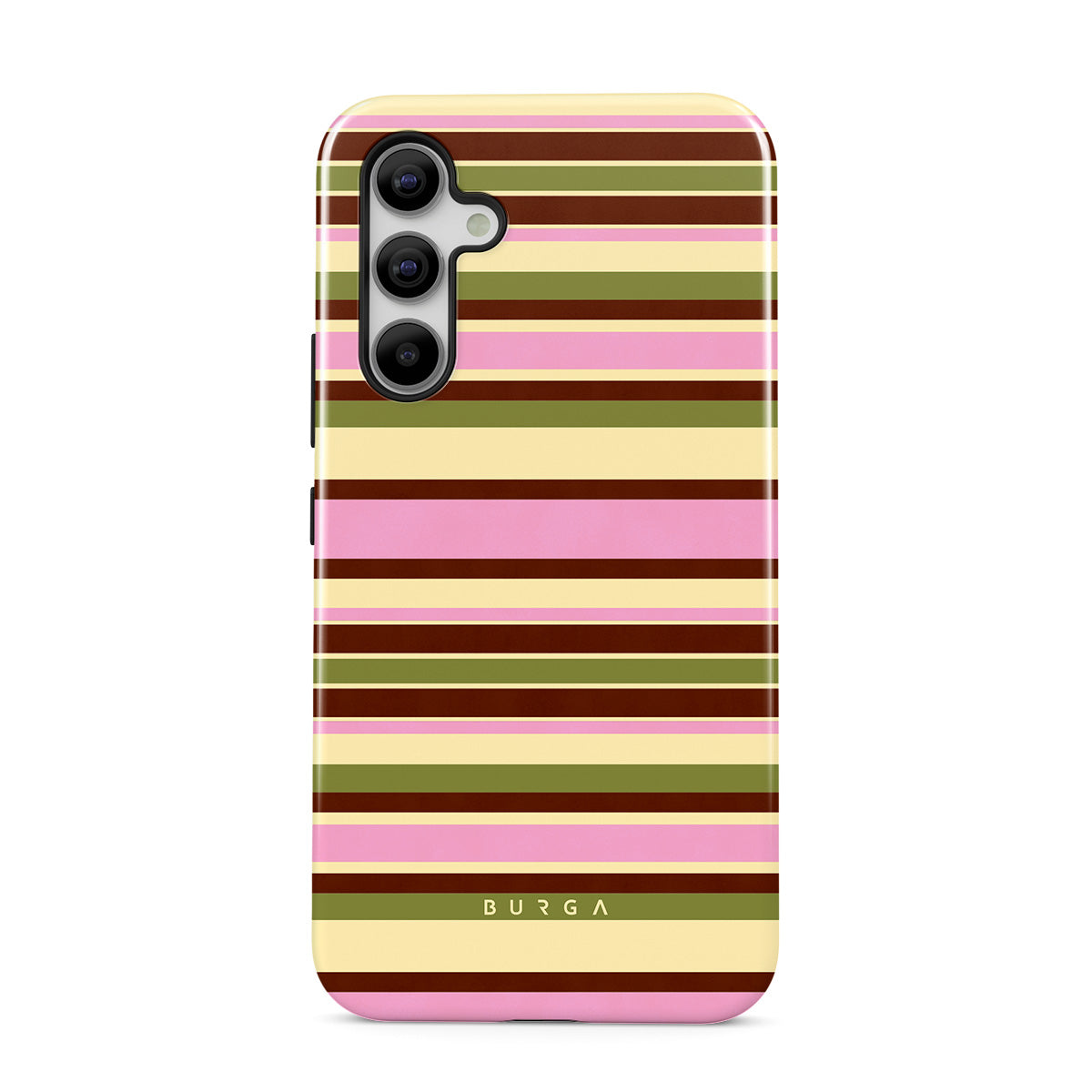 このデザインの特徴:ピンク、黄色、緑のパステルストライプ、夏のパターン