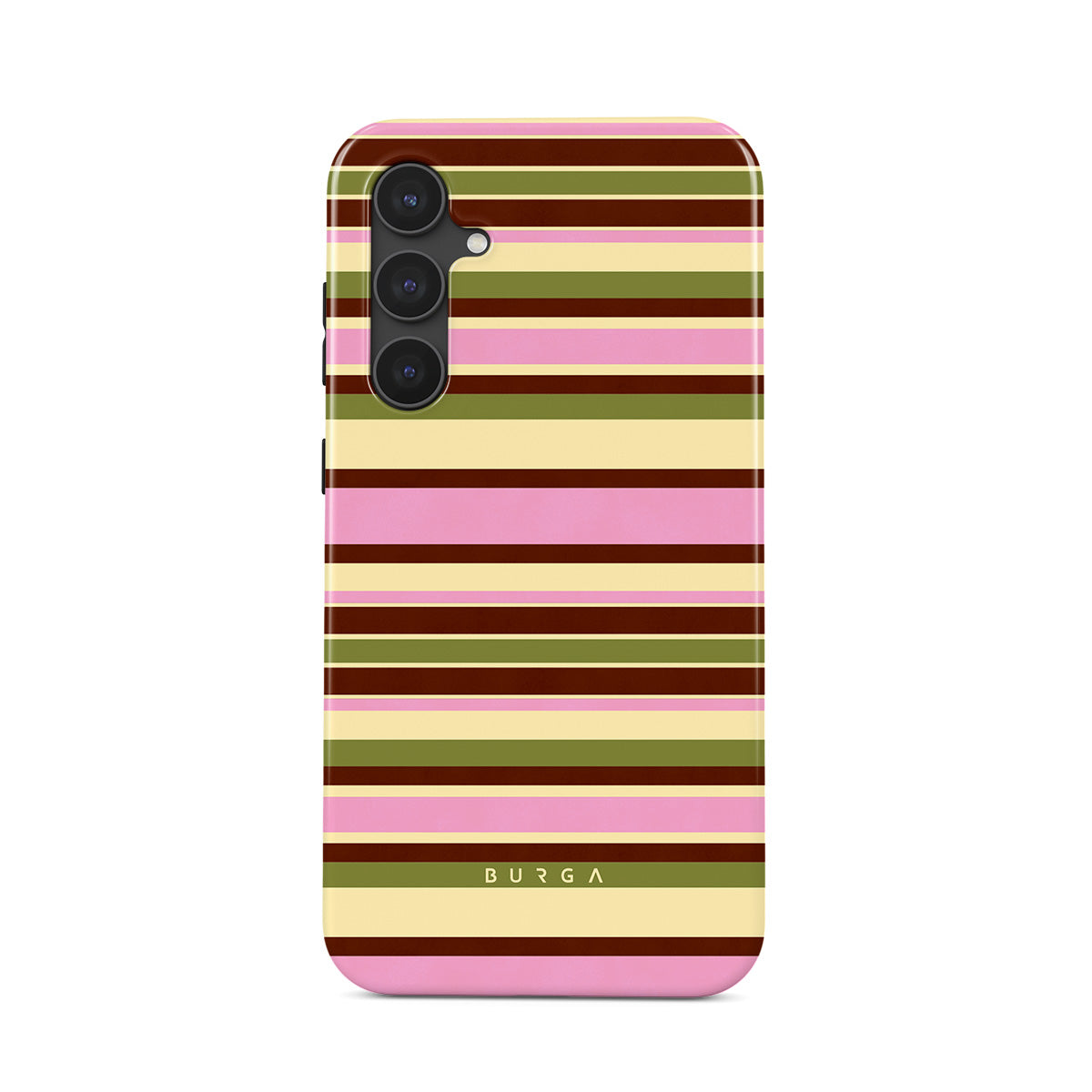 このデザインの特徴:ピンク、黄色、緑のパステルストライプ、夏のパターン