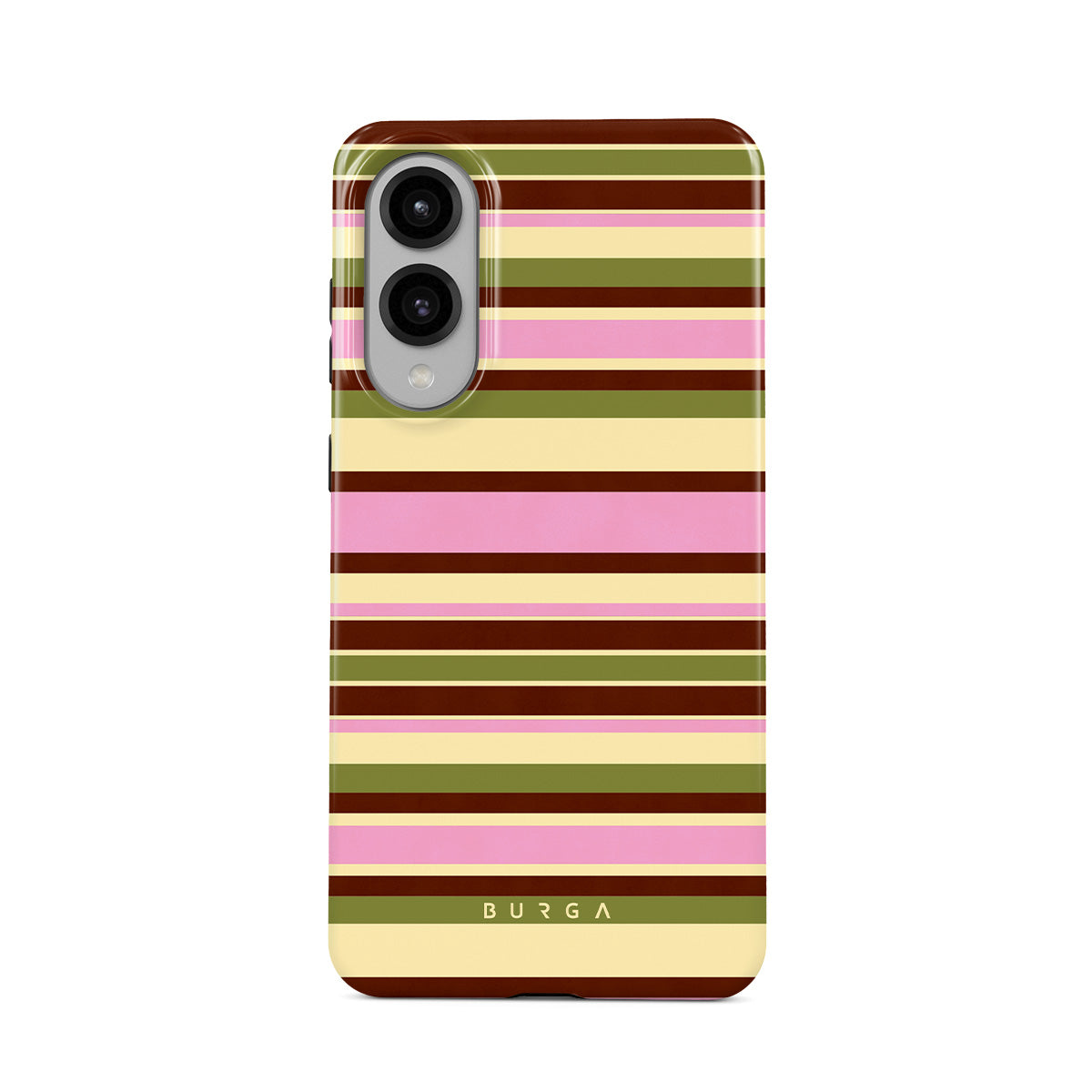 このデザインの特徴:ピンク、黄色、緑のパステルストライプ、夏のパターン