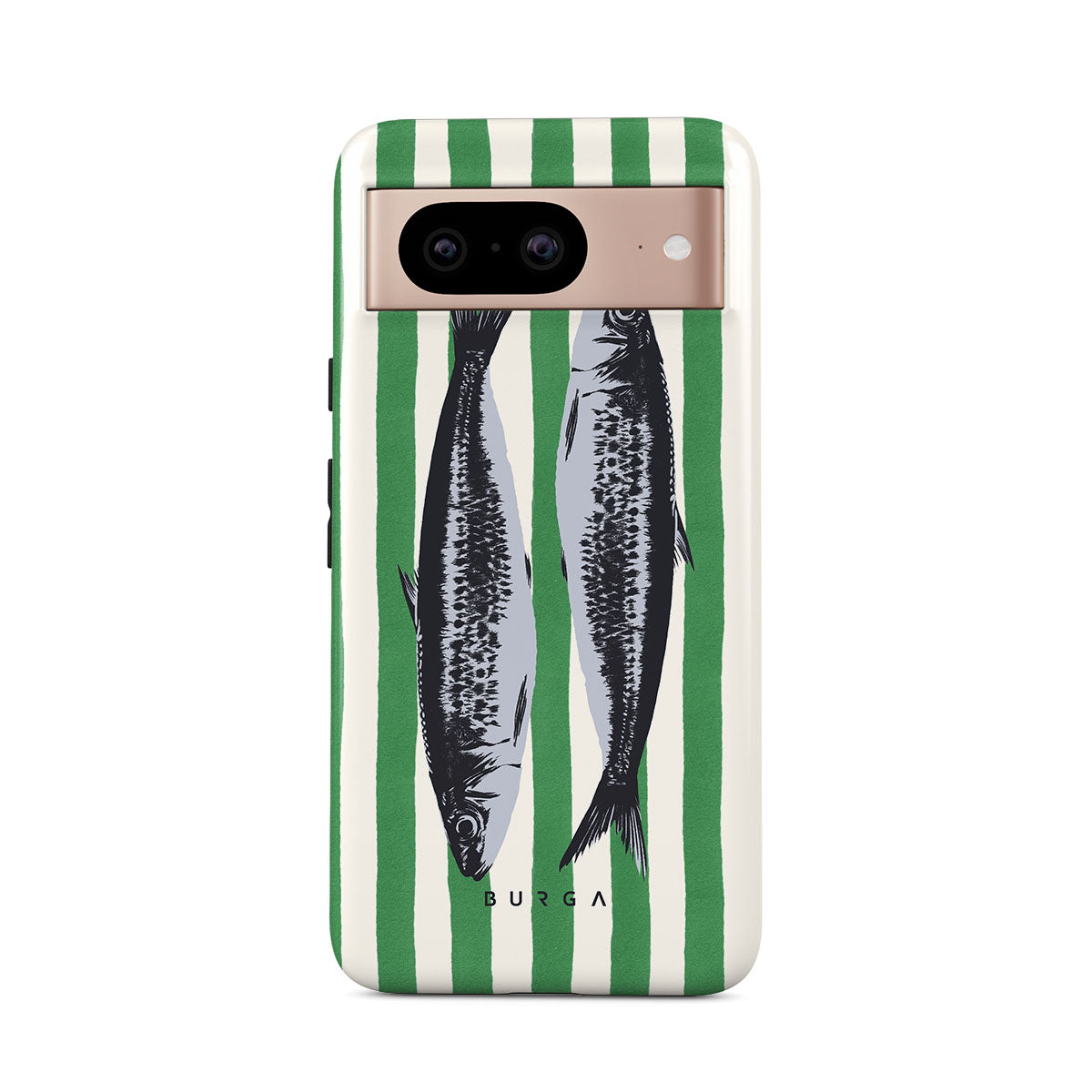 このデザインの特徴サーディン、緑のストライプ、海のモチーフが含まれています