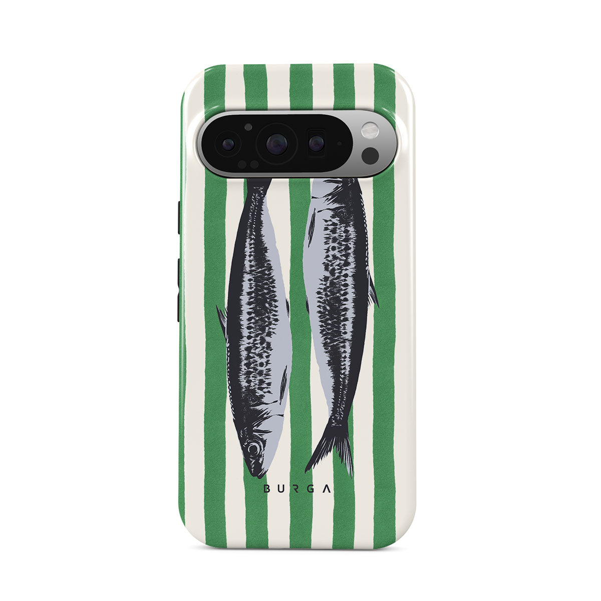 このデザインの特徴サーディン、緑のストライプ、海のモチーフが含まれています