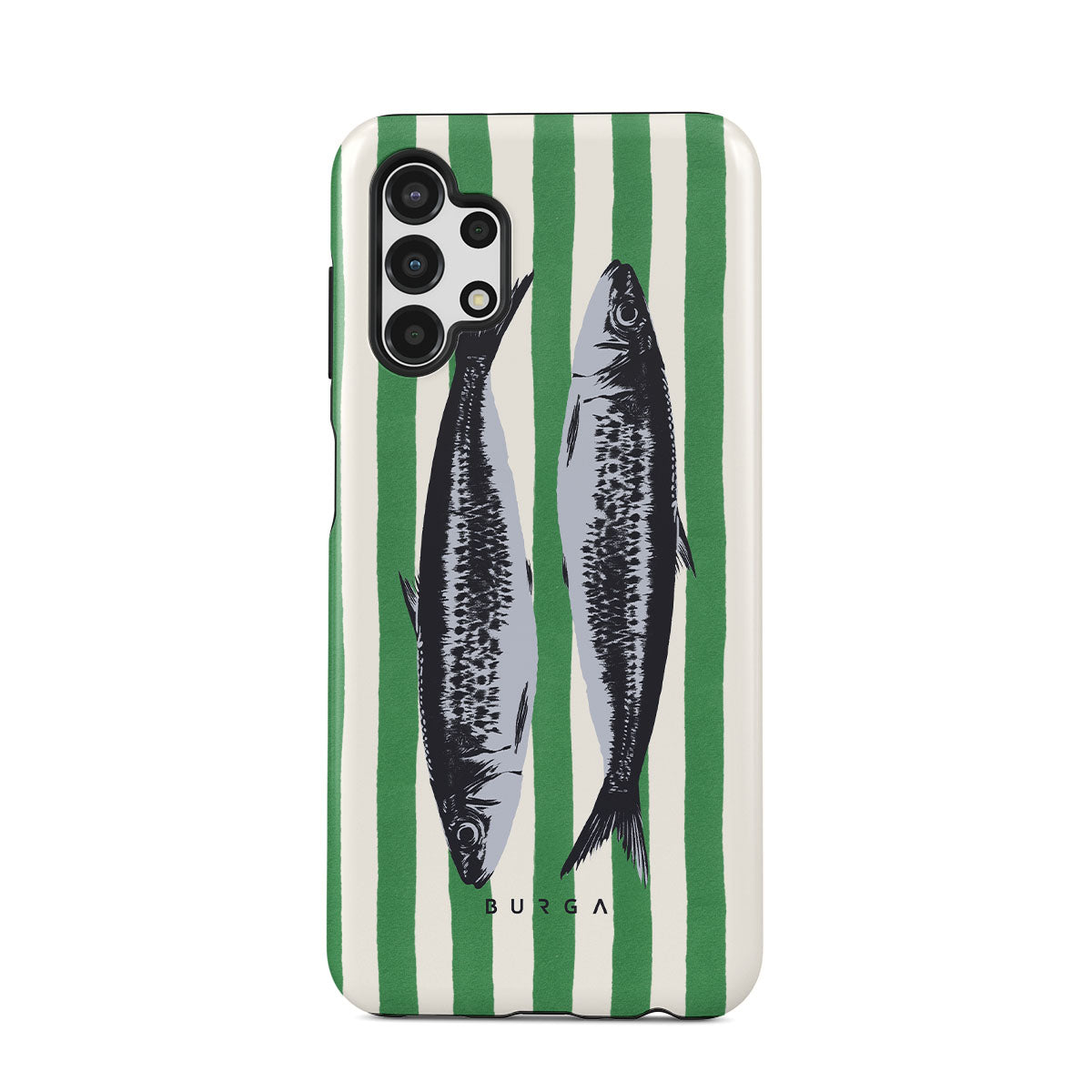 このデザインの特徴サーディン、緑のストライプ、海のモチーフが含まれています