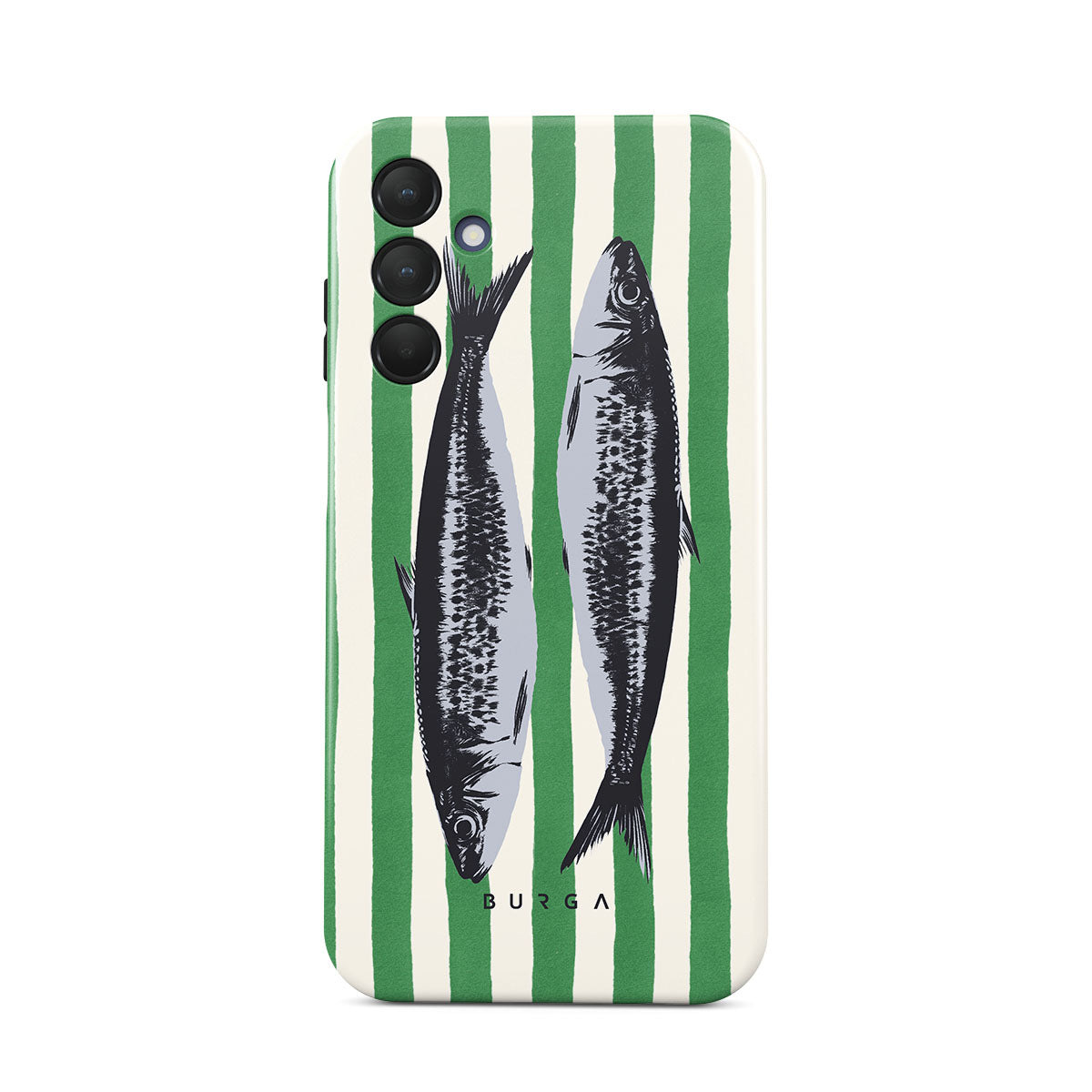 このデザインの特徴サーディン、緑のストライプ、海のモチーフが含まれています