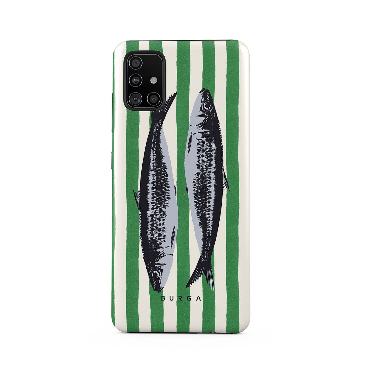 このデザインの特徴サーディン、緑のストライプ、海のモチーフが含まれています