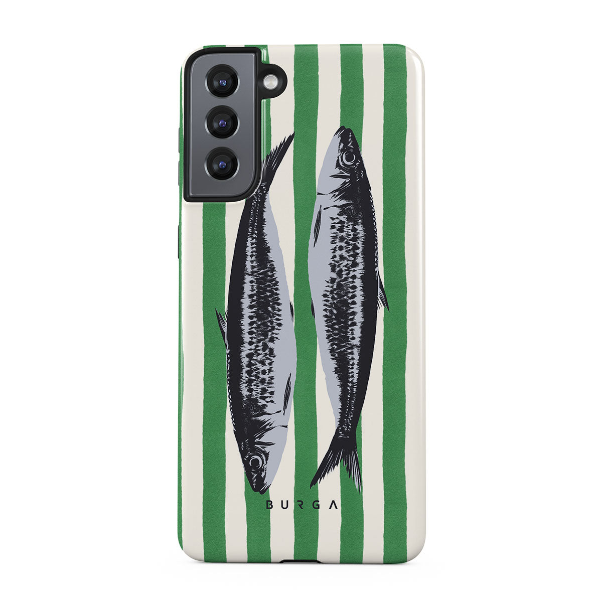 このデザインの特徴サーディン、緑のストライプ、海のモチーフが含まれています