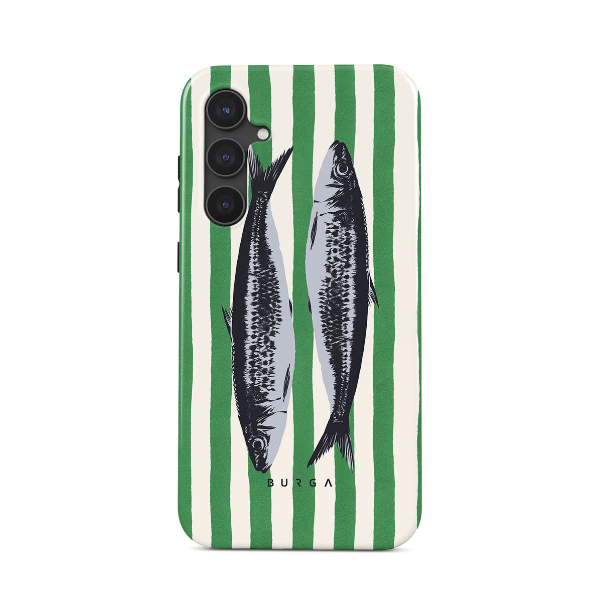 このデザインの特徴サーディン、緑のストライプ、海のモチーフが含まれています