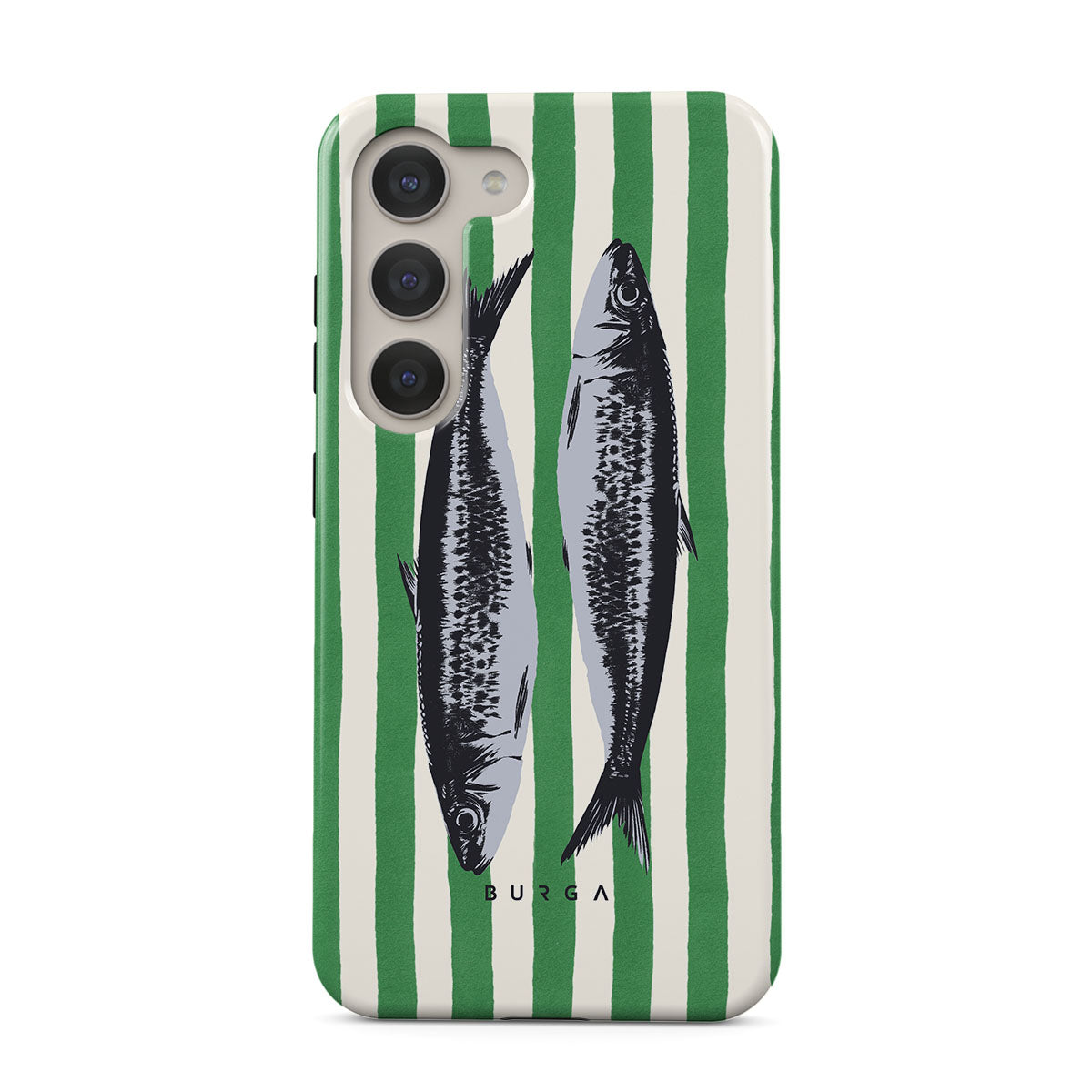 このデザインの特徴サーディン、緑のストライプ、海のモチーフが含まれています