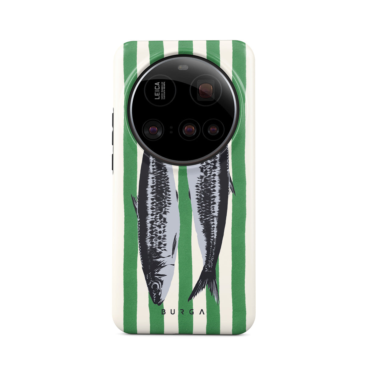 このデザインの特徴サーディン、緑のストライプ、海のモチーフが含まれています