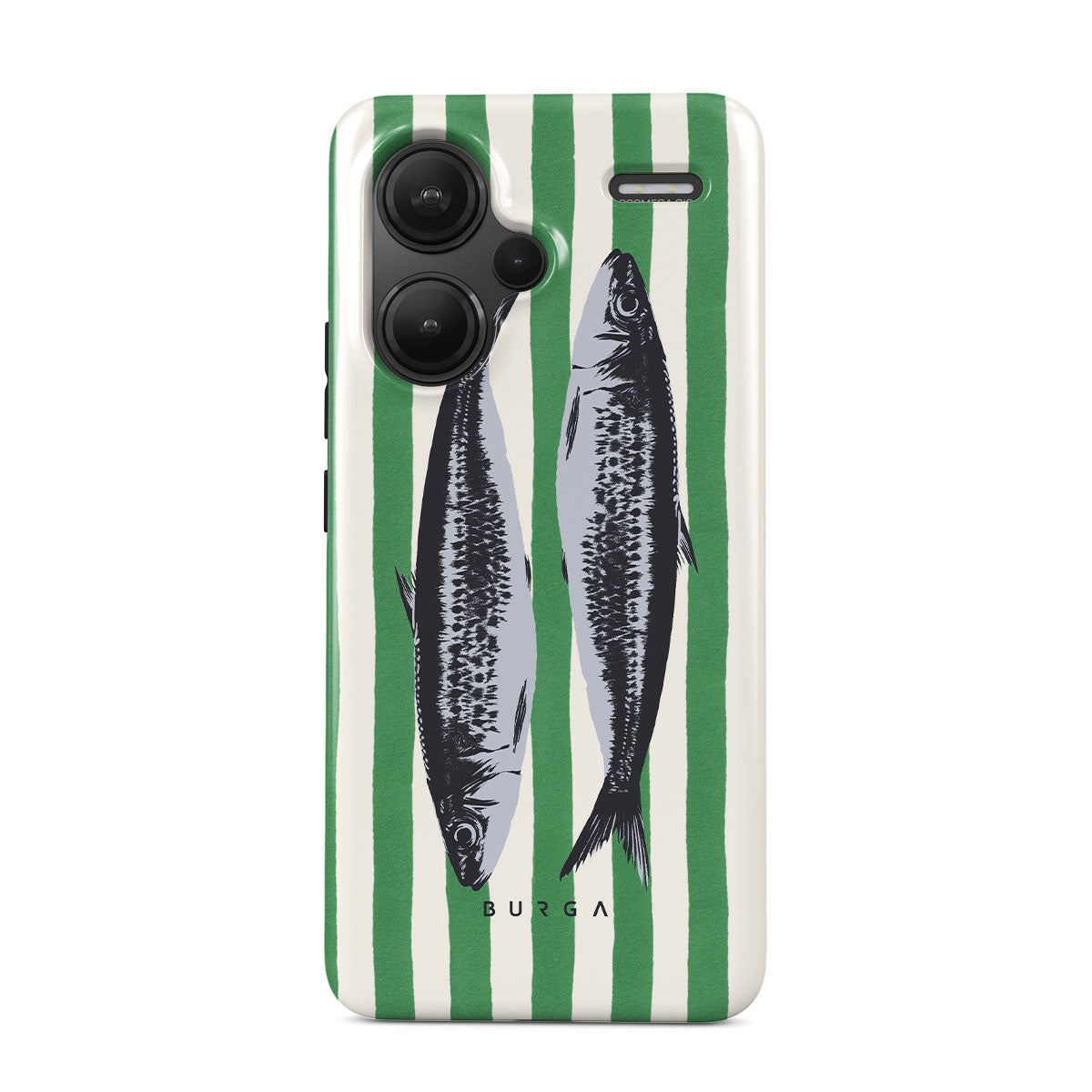 このデザインの特徴サーディン、緑のストライプ、海のモチーフが含まれています