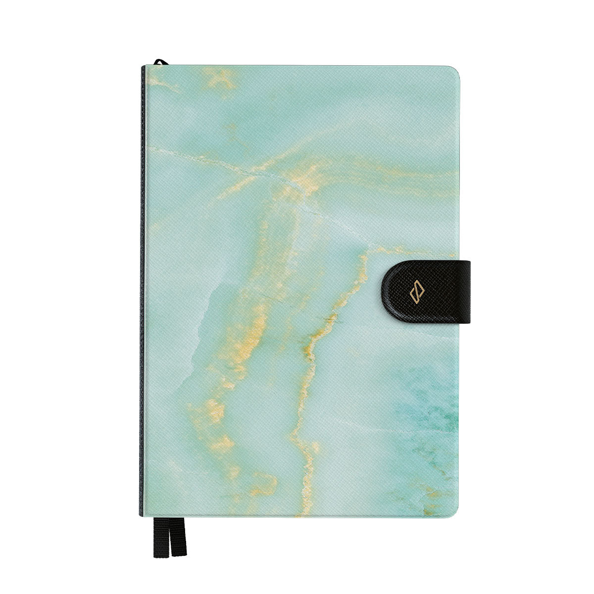日付が書かれていないミニマリストなデザインで、手帳・スケジュール帳・ダイアリーとして使えます。表紙のハードカバーには、心地よい手触りのヴィーガンサフィアーノレザーを使用。スリムな磁気べえると付きの頑丈な手帳で、コーヒーをこぼしたり、うっかり手帳を落としたりしても安心です。