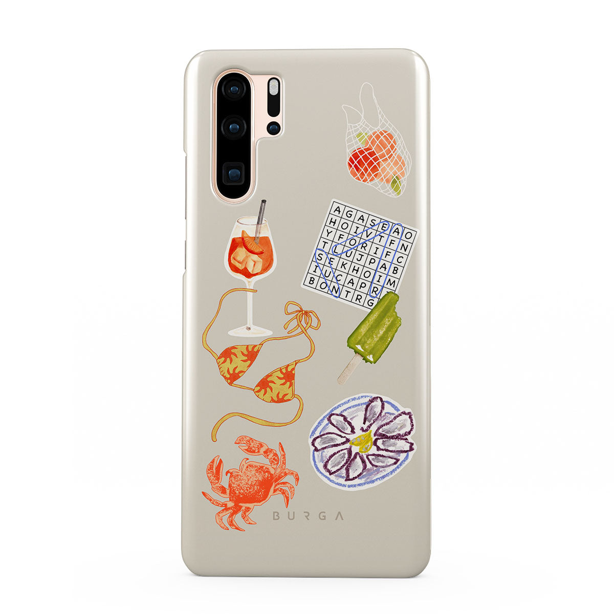 このデザインの特徴:、カニ、オイスターのプレート、アイスキャンディー、クロスワードパズル、スプリッツカクテル、ビキニトップ、フルーツが含まれています。