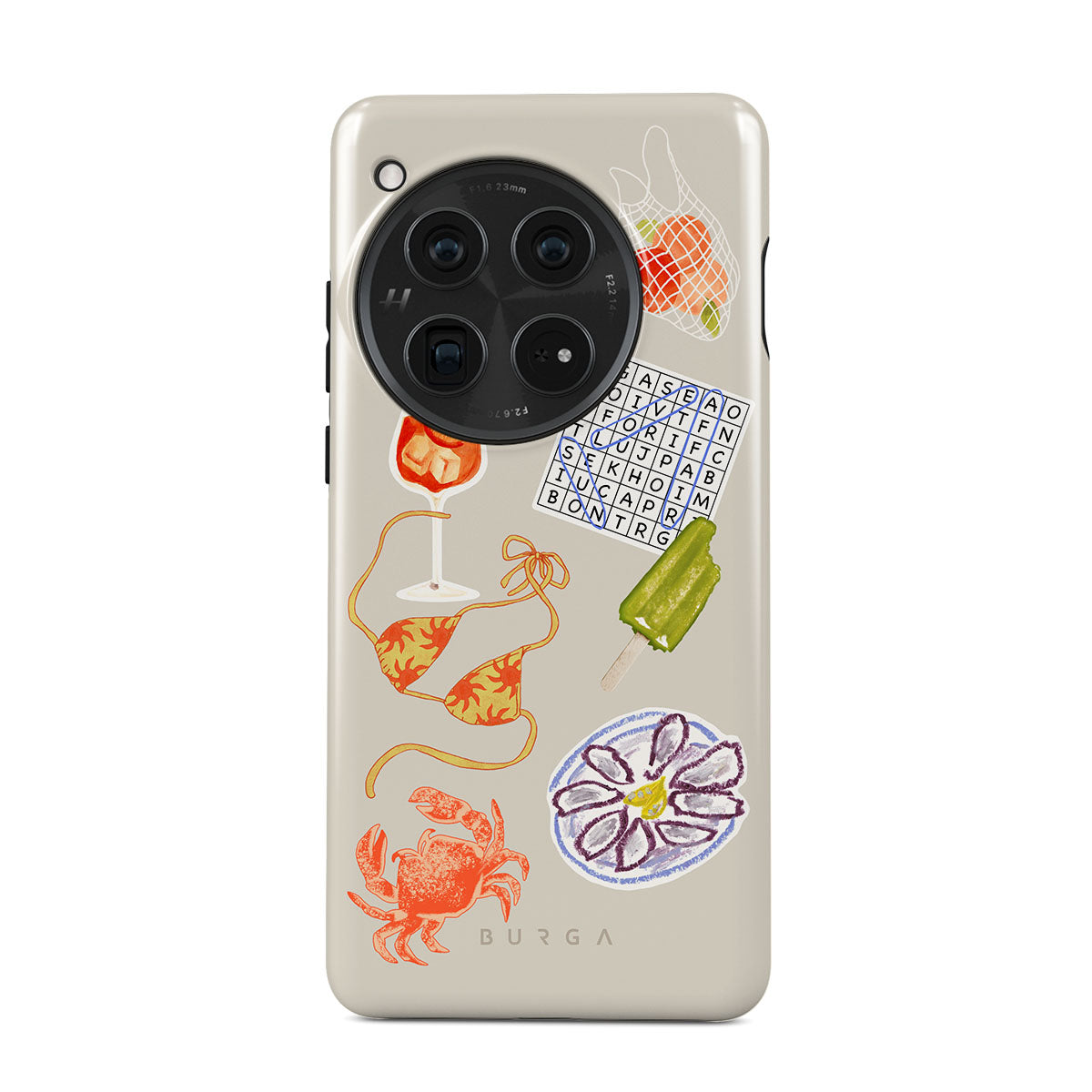 このデザインの特徴:、カニ、オイスターのプレート、アイスキャンディー、クロスワードパズル、スプリッツカクテル、ビキニトップ、フルーツが含まれています。