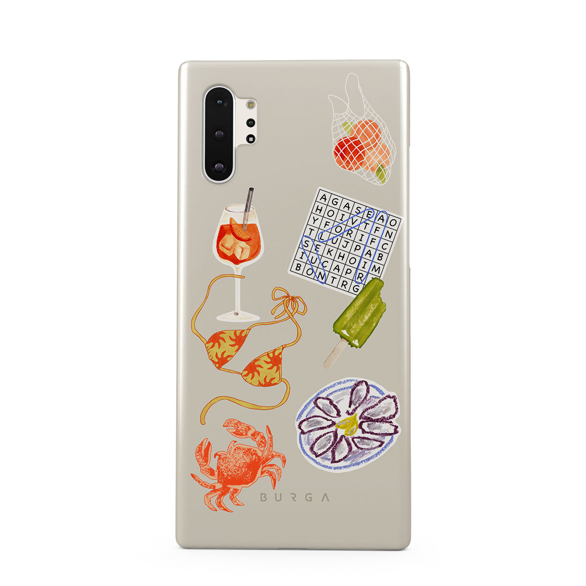 このデザインの特徴:、カニ、オイスターのプレート、アイスキャンディー、クロスワードパズル、スプリッツカクテル、ビキニトップ、フルーツが含まれています。