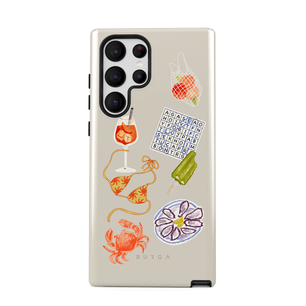 このデザインの特徴:、カニ、オイスターのプレート、アイスキャンディー、クロスワードパズル、スプリッツカクテル、ビキニトップ、フルーツが含まれています。