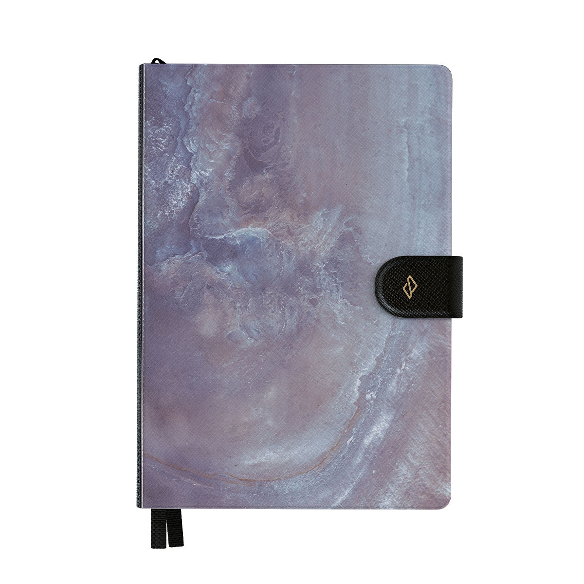 日付が書かれていないミニマリストなデザインで、手帳・スケジュール帳・ダイアリーとして使えます。表紙のハードカバーには、心地よい手触りのヴィーガンサフィアーノレザーを使用。スリムな磁気べえると付きの頑丈な手帳で、コーヒーをこぼしたり、うっかり手帳を落としたりしても安心です。