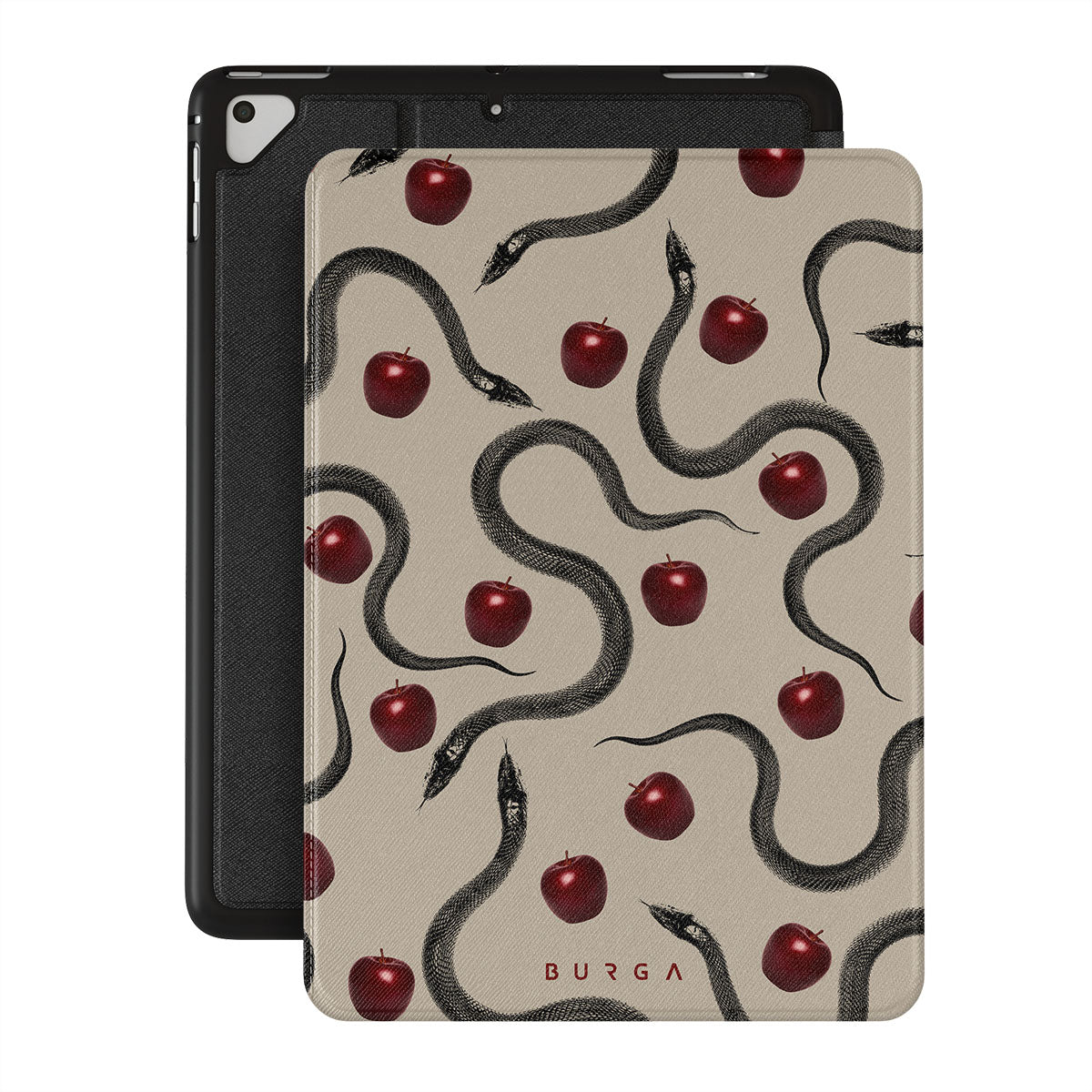 このデザインの特徴は、ツヤツヤの真っ赤なリンゴ、巻きつくヘビ、ベージュの色調。