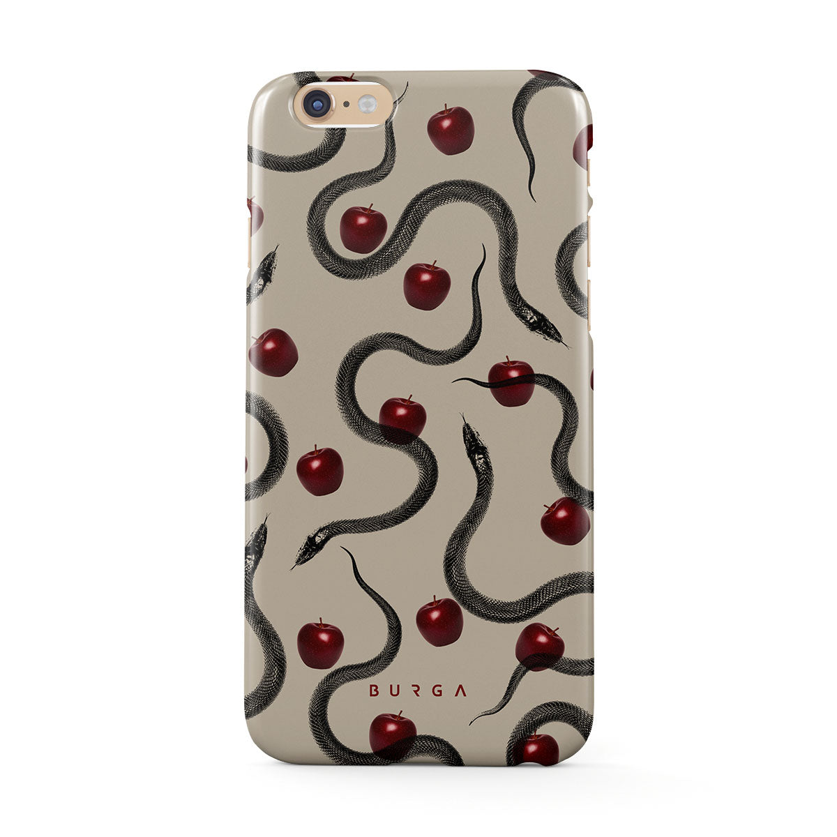 このデザインの特徴は、ツヤツヤの真っ赤なリンゴ、巻きつくヘビ、ベージュの色調。