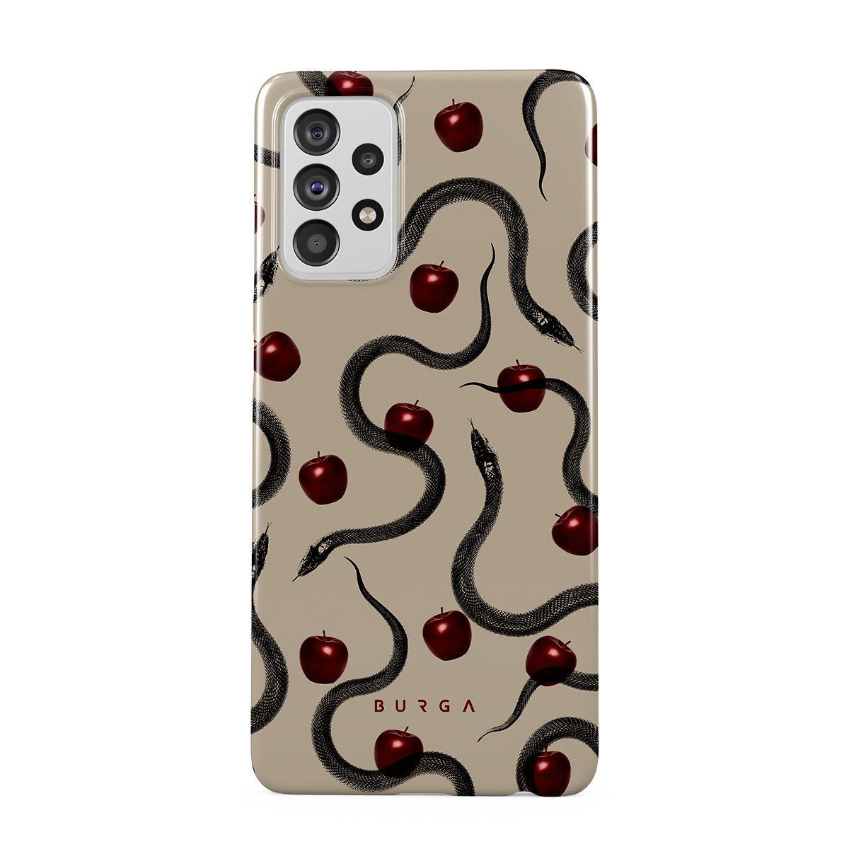 このデザインの特徴は、ツヤツヤの真っ赤なリンゴ、巻きつくヘビ、ベージュの色調。