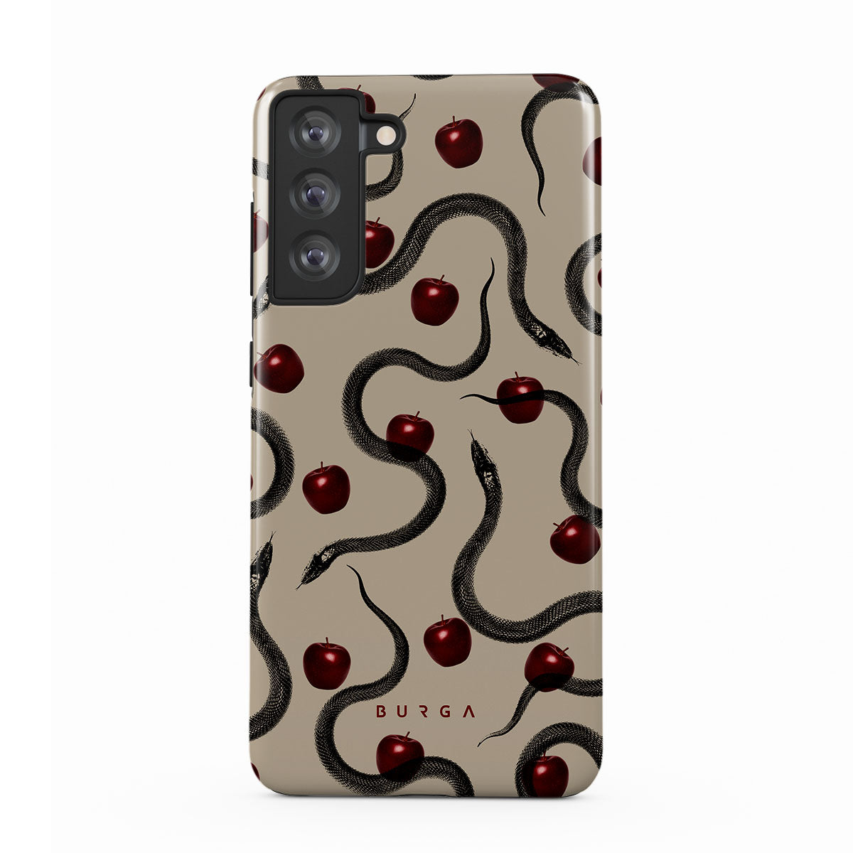 このデザインの特徴は、ツヤツヤの真っ赤なリンゴ、巻きつくヘビ、ベージュの色調。