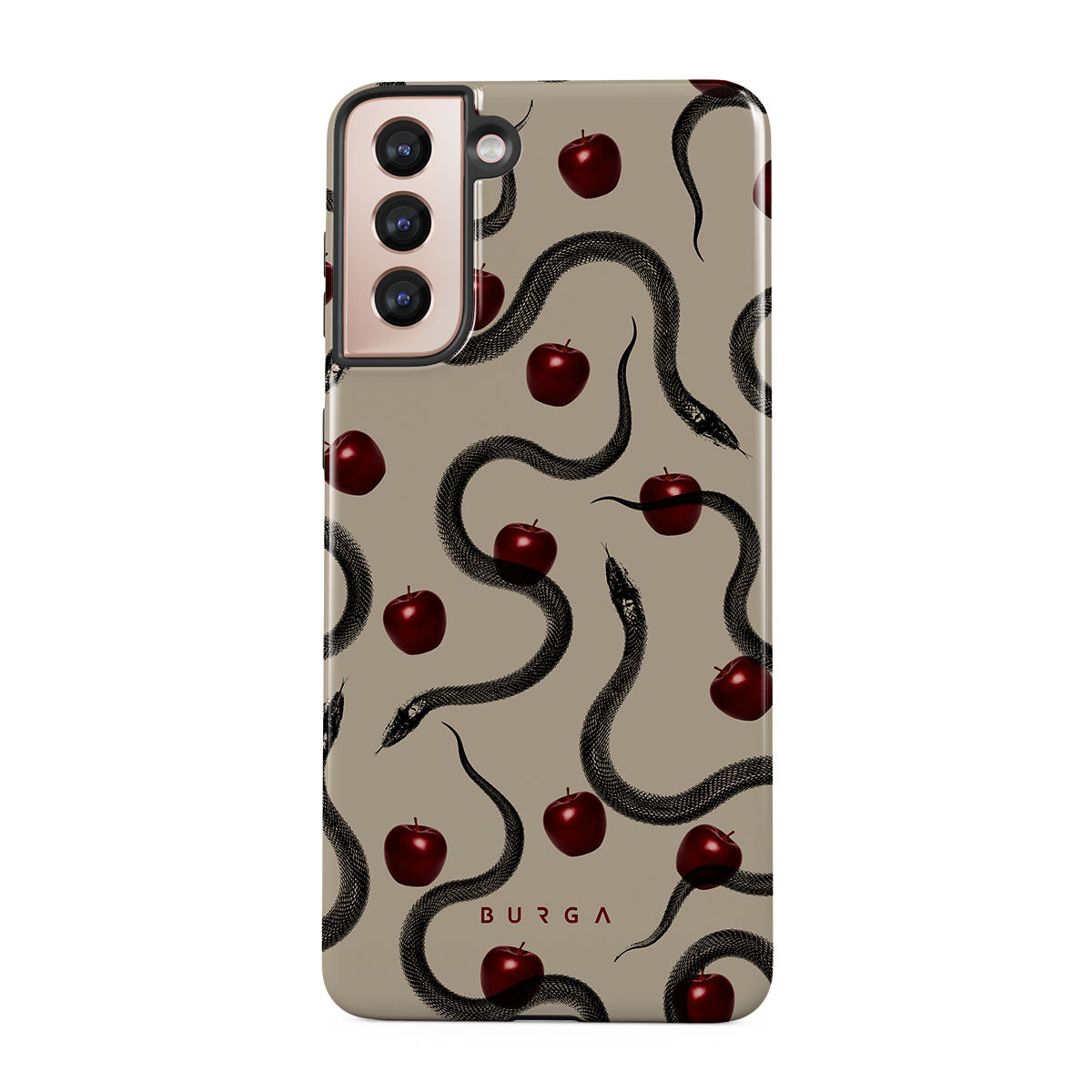 このデザインの特徴は、ツヤツヤの真っ赤なリンゴ、巻きつくヘビ、ベージュの色調。