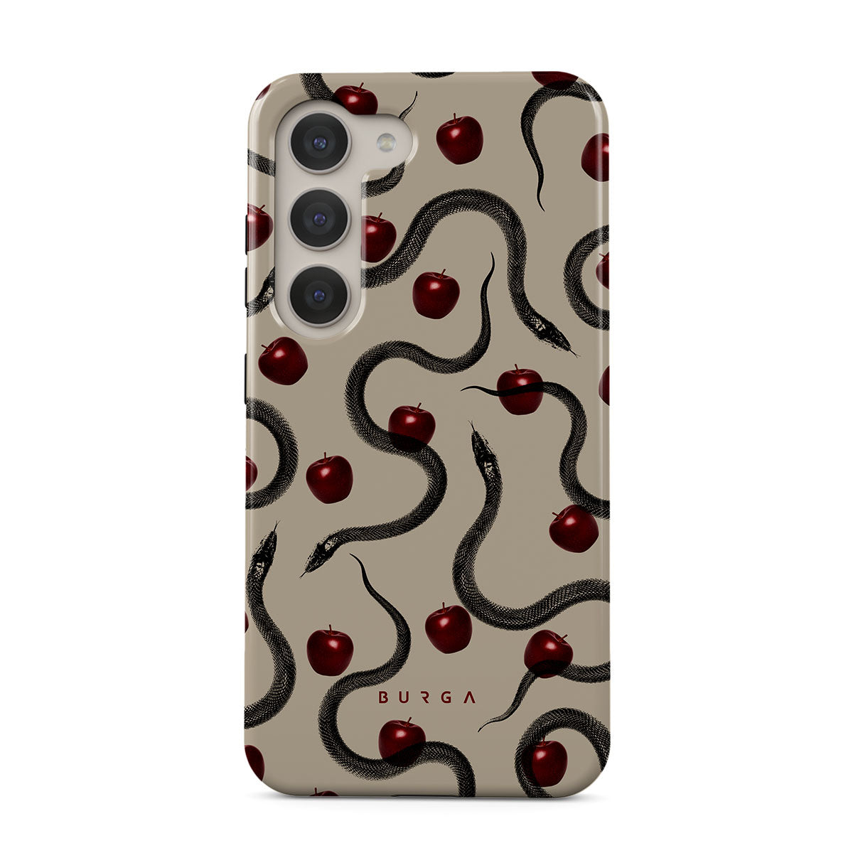 このデザインの特徴は、ツヤツヤの真っ赤なリンゴ、巻きつくヘビ、ベージュの色調。