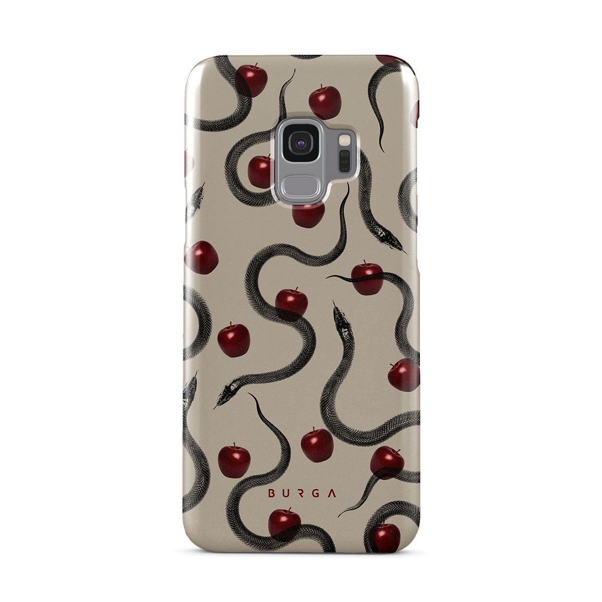 このデザインの特徴は、ツヤツヤの真っ赤なリンゴ、巻きつくヘビ、ベージュの色調。