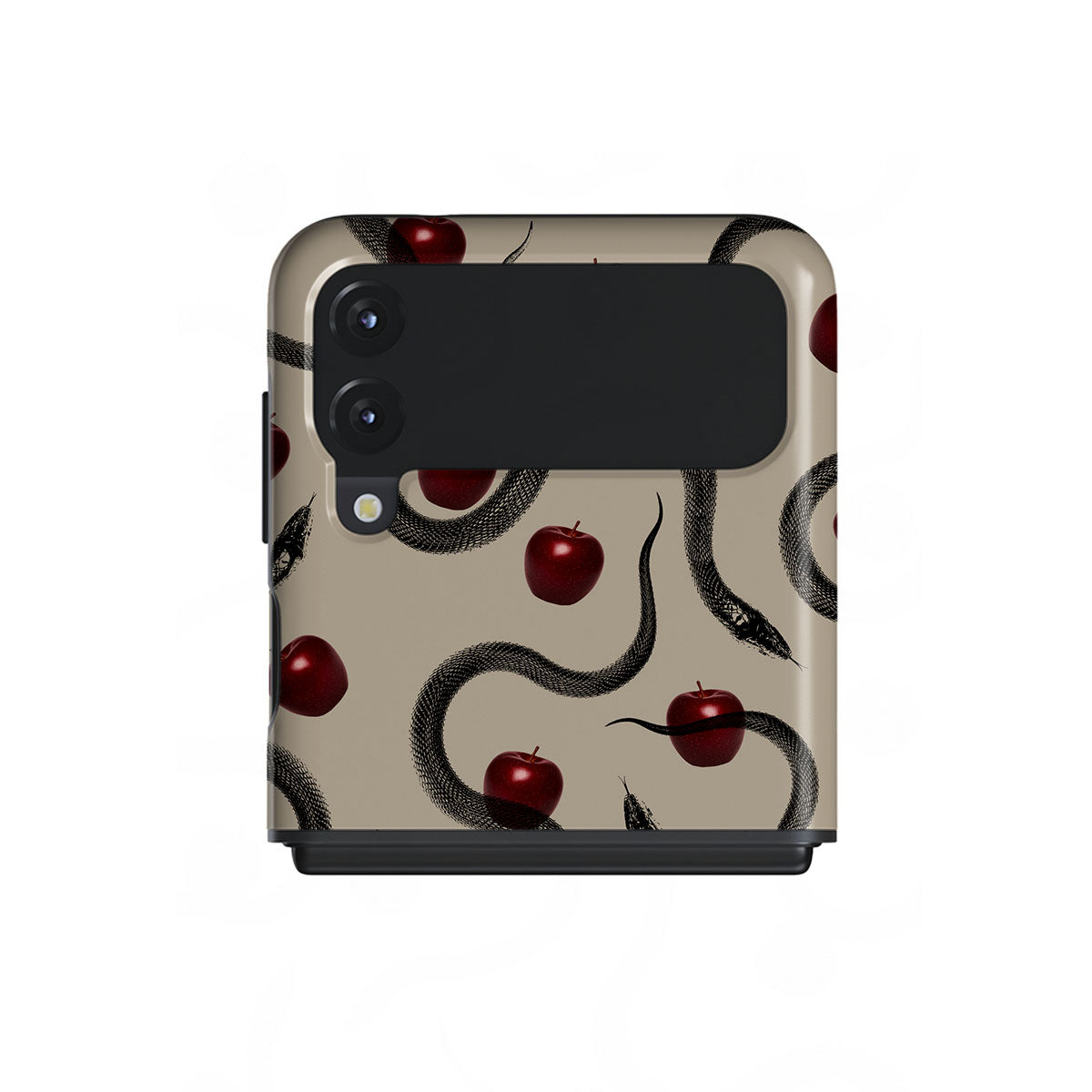 このデザインの特徴は、ツヤツヤの真っ赤なリンゴ、巻きつくヘビ、ベージュの色調。