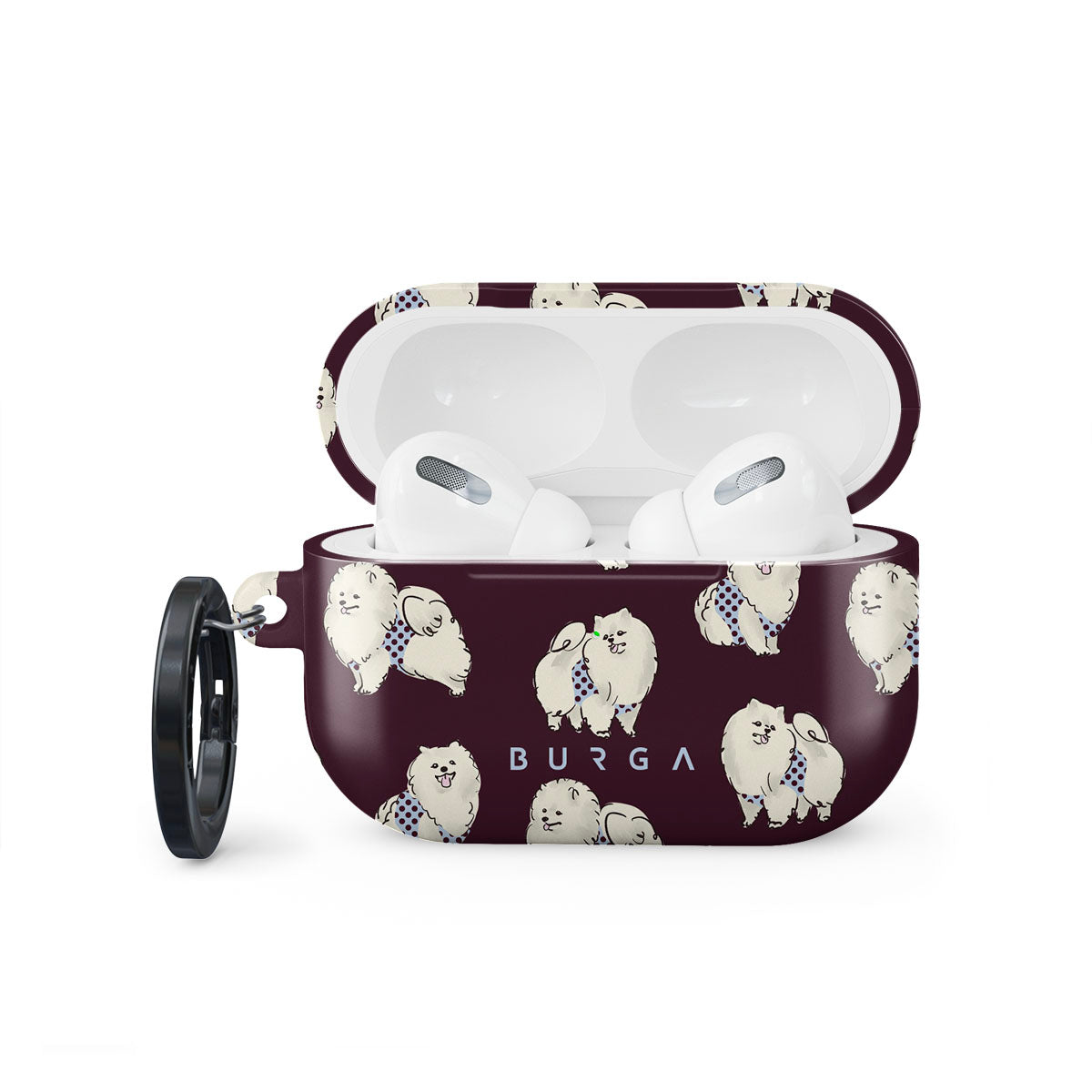 このデザインの特徴:深いバーガンディ色の背景に白くてふわふわの犬(プードル)が描かれており、ペット好きにぴったりです。