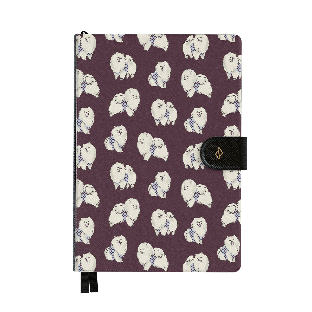 このデザインの特徴:深いバーガンディ色の背景に白くてふわふわの犬(プードル)が描かれており、ペット好きにぴったりです。