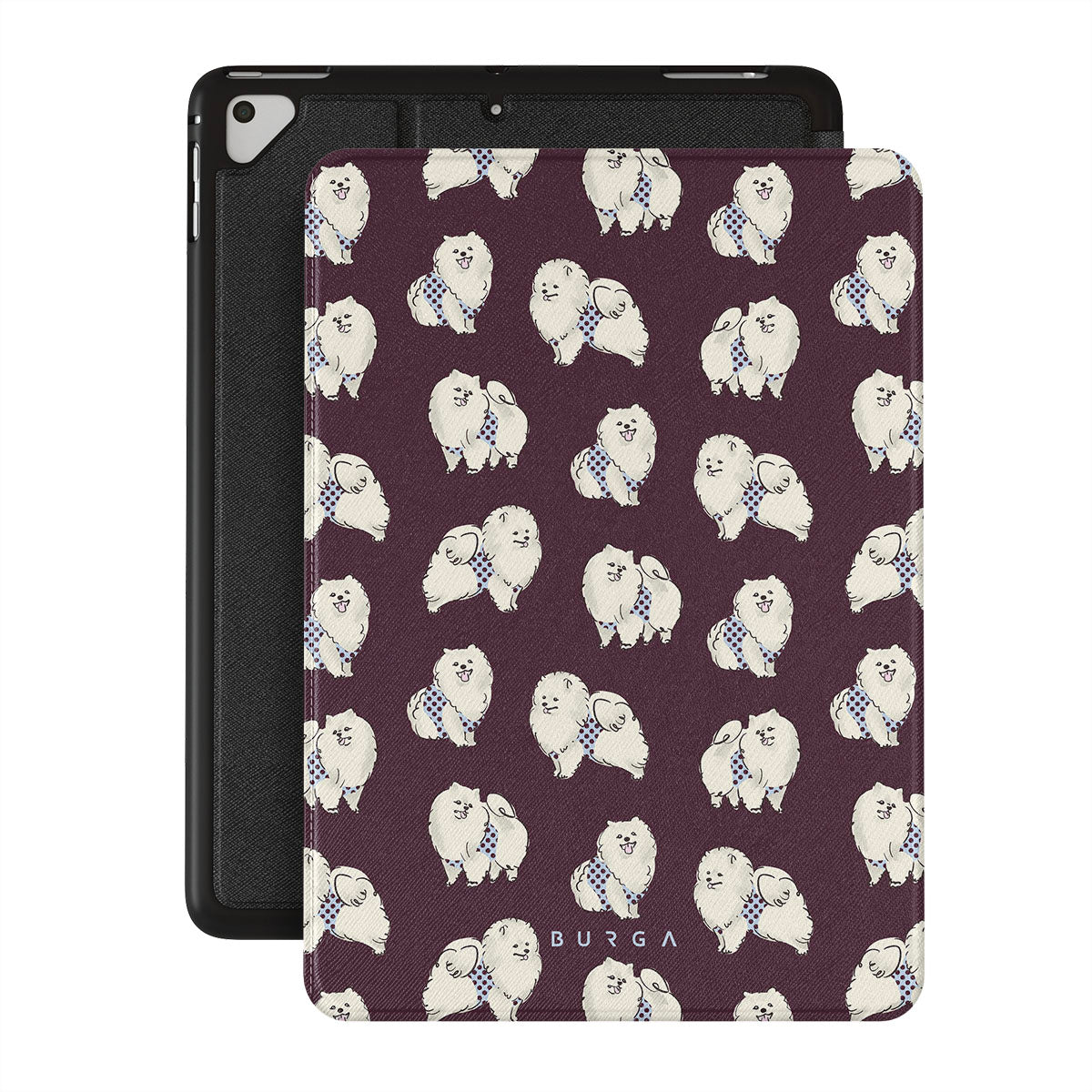 このデザインの特徴:深いバーガンディ色の背景に白くてふわふわの犬(プードル)が描かれており、ペット好きにぴったりです。