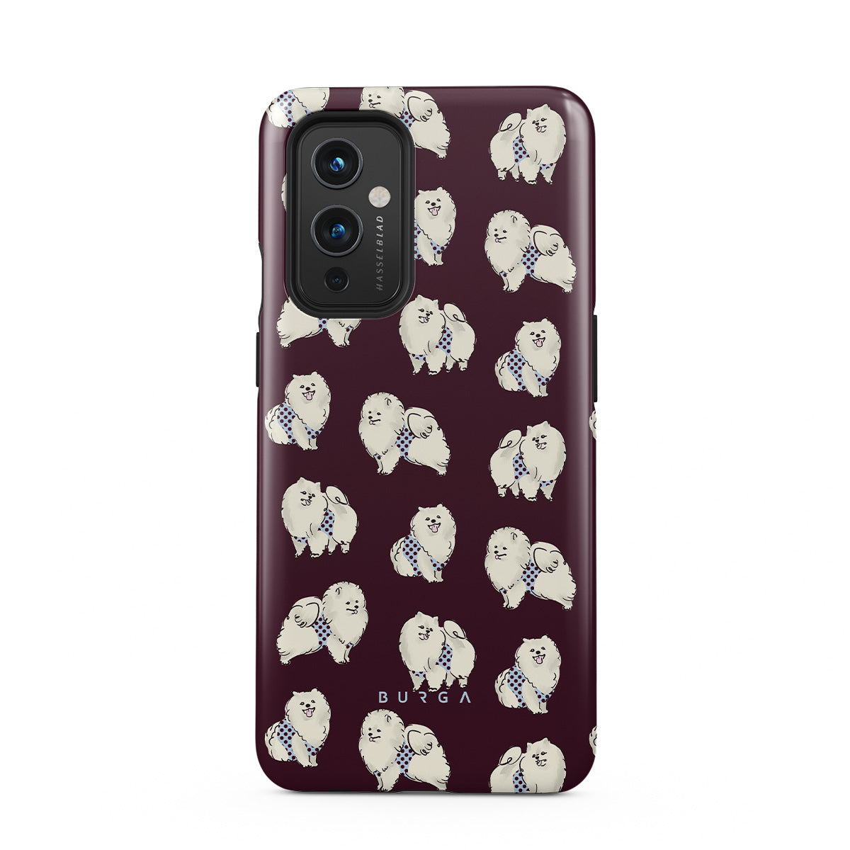 このデザインの特徴:深いバーガンディ色の背景に白くてふわふわの犬(プードル)が描かれており、ペット好きにぴったりです。