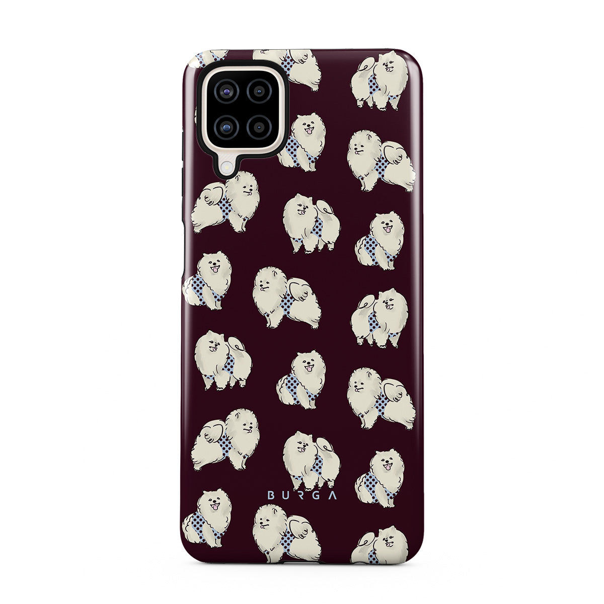 このデザインの特徴:深いバーガンディ色の背景に白くてふわふわの犬(プードル)が描かれており、ペット好きにぴったりです。