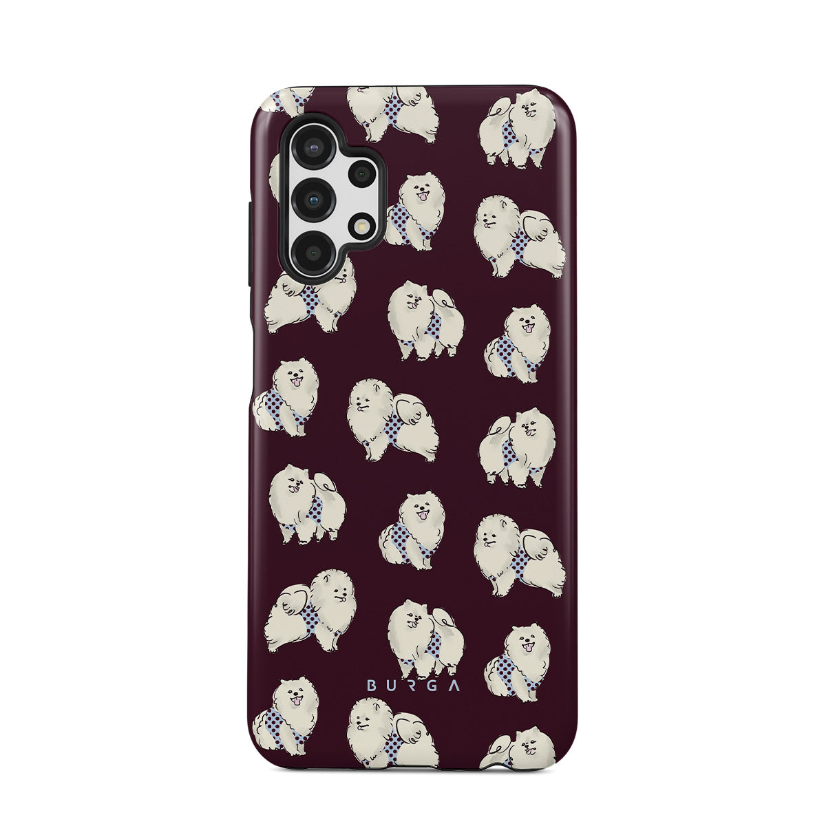 このデザインの特徴:深いバーガンディ色の背景に白くてふわふわの犬(プードル)が描かれており、ペット好きにぴったりです。