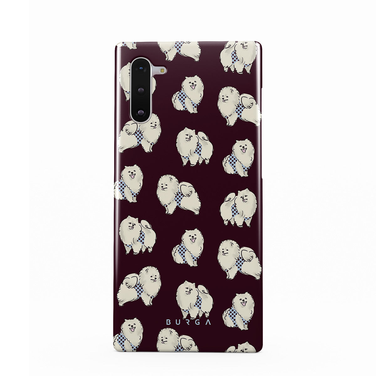 このデザインの特徴:深いバーガンディ色の背景に白くてふわふわの犬(プードル)が描かれており、ペット好きにぴったりです。