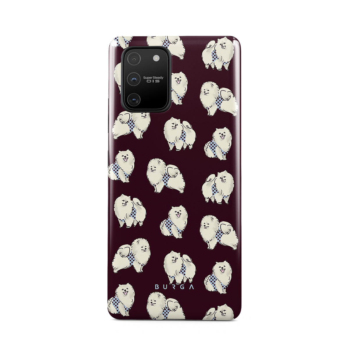 このデザインの特徴:深いバーガンディ色の背景に白くてふわふわの犬(プードル)が描かれており、ペット好きにぴったりです。