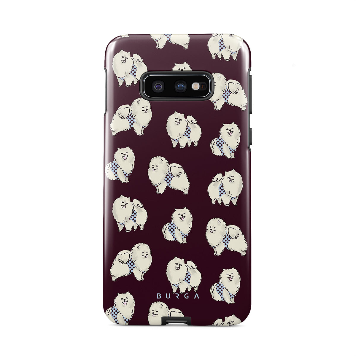 このデザインの特徴:深いバーガンディ色の背景に白くてふわふわの犬(プードル)が描かれており、ペット好きにぴったりです。